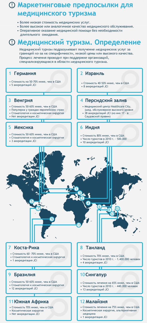 Стратегия глобального сервиса. Количество стран, в которых сумели по достоинству оценить потенциал рынка медицинского туризма, растет год от года. Все больше фирм предлагают своим клиентам глобальный сервис, включающий в себя медицинскую помощь, размещение и проживание, туристическое обслуживание. Речь идет не только о туристических агентствах. В большинстве мировых медицинских центров открыты подразделения, специализирующиеся исключительно на лечении иностранных граждан.